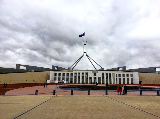 Für was ist Canberra hauptsächlich bekannt? Natürlich dafür, dass es die Haupstadt und damit der Regierungssitz Australiens ist. Und als gute Politkstudentin muss ich da natürlich hin – und mir mal das Parlament anschauen. Also hab ich mich nach einem relativ ausgedehnten Frühstück auf den Weg gemacht, und gleich mal entdeckt, dass Canberra einen gratis Touri-Bus hat. Top-Sache, vor allem, wenn man wie ich im Winter da ist… 😉