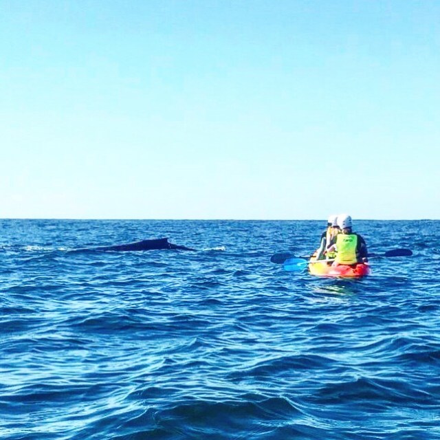Ich hab mir mein Kajak mit Louise aus England geteilt, und schon beim Einsteigen hab ich meine Go Pro versenkt… Also kurzes Mann-über-Bord Manöver und die Kamera gerettet und dann waren wir auch schon am Weg „into the deep blue“. Die 3 Guides waren spitze, eine davon hat sogar Meeresbiologie studiert und konnte uns ganz viel erklären und zeigen. Schon nach 5 Minuten hätte ich versehentlich fast einer Schilkröte mein Paddel über die Rübe gezogen – die sind so neugierig ganz nah an unsere Kajak rangeschwommen. Das eigentliche Highlight war dann aber wirklich ganz draußen, am sogenannten Wal-Highway. Irgendwie sind wir zwei beim Beobachten und Dösen in der Sonne ein bisserl abgetrieben von den anderen und auf einmal taucht vor uns ein Wal auf – keine 15 Meter entfernt!